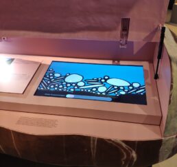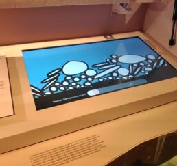 Die Applikation zeigt vereinfacht die Bewegung der Kieselsteine in einem Fluss. Der Benutzer kann die Fliessgeschwindigkeit einstellen. Über eine „Physics-Engine“ wird die Bewegung der Kiesel in Echtzeit berechnet und simuliert. Die Applikation wird auf einem Raspberry Pi betrieben, welcher per Strom an/aus geschaltet wird und selbständig ohne weiteres Zutun startet.
